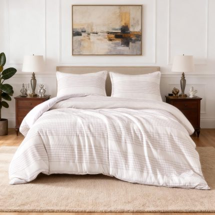 ALL-SEASON COMFORT: Lightweight down-alternative filling for year-round comfort SUBTLE JACQUARD AESTHETIC: Understated stripe pattern blends with modern, classic, or minimalist bedroom decor WHAT'S INCLUDED: King-size set with 1 Comforter (104" x 90"), 2 Pillow Shams (20" x 36") OEKO - TEX MADE IN GREEN CERTIFIED: Produced more sustainably in socially responsible workplaces and tested for harmful substances EASY CARE: Machine wash cold and tumble dry low for hassle-free maintenance