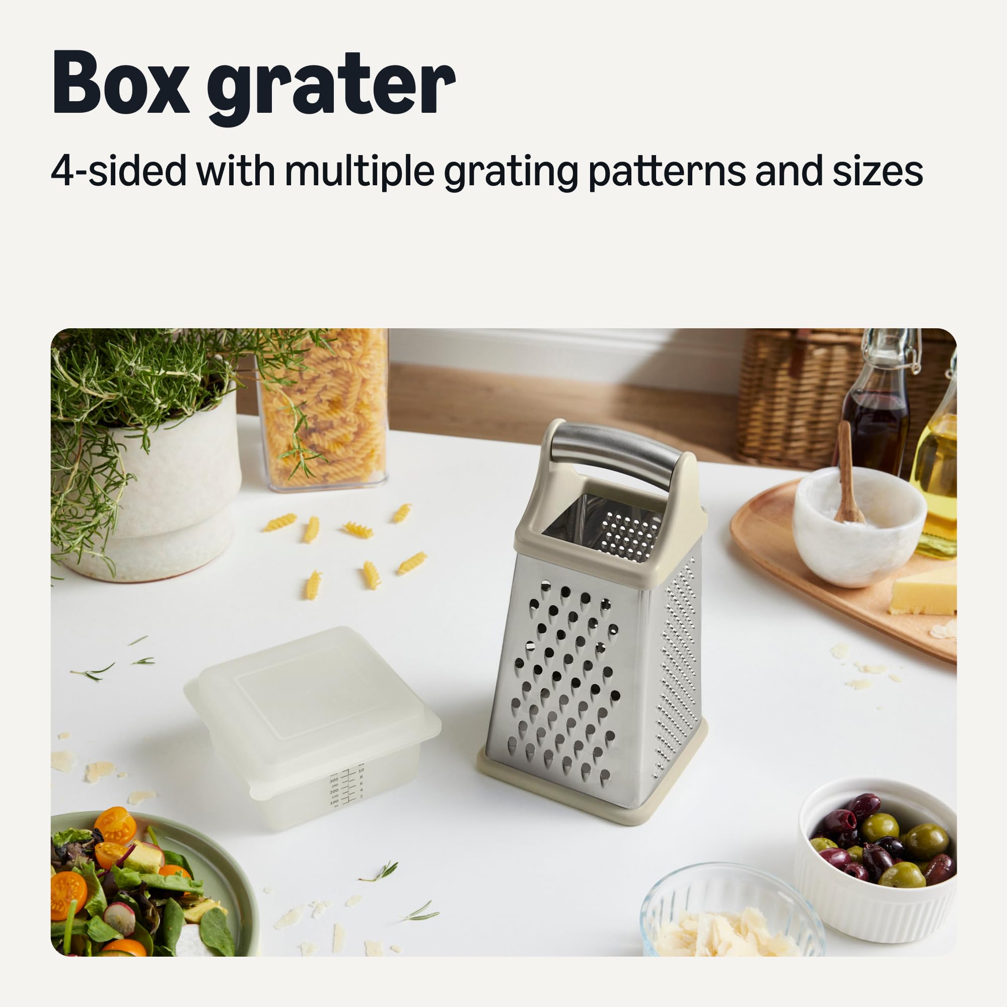This versatile 4-sided stainless steel grater offers fine, medium, coarse, and slice options to handle all your kitchen grating needs. The included measurement container catches and measures ingredients while grating, and both pieces are dishwasher-safe for easy cleanup. Amazon Basics are the quality products you count on for all your everyday moments.