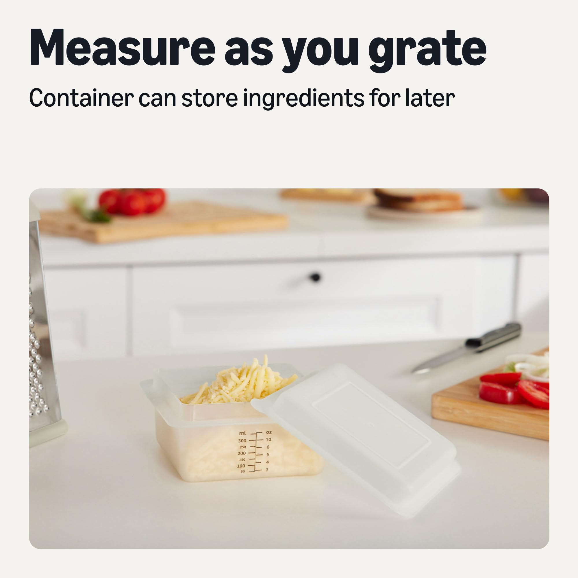 MEASUREMENT CONTAINER: Storage container with measurement markings helps track portion sizes while catching grated ingredients; stores inside grater when not in use