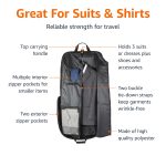 Holds up to 3 suits or dresses with extra room for shoes, belts, ties, and toiletries
