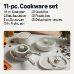 Ceramic Nonstick Pots and Pans Set with Detachable handle, 11-Piece Stackable set, All Cooktop Friendly, Includes Saucepan, Frying pan, Ivory