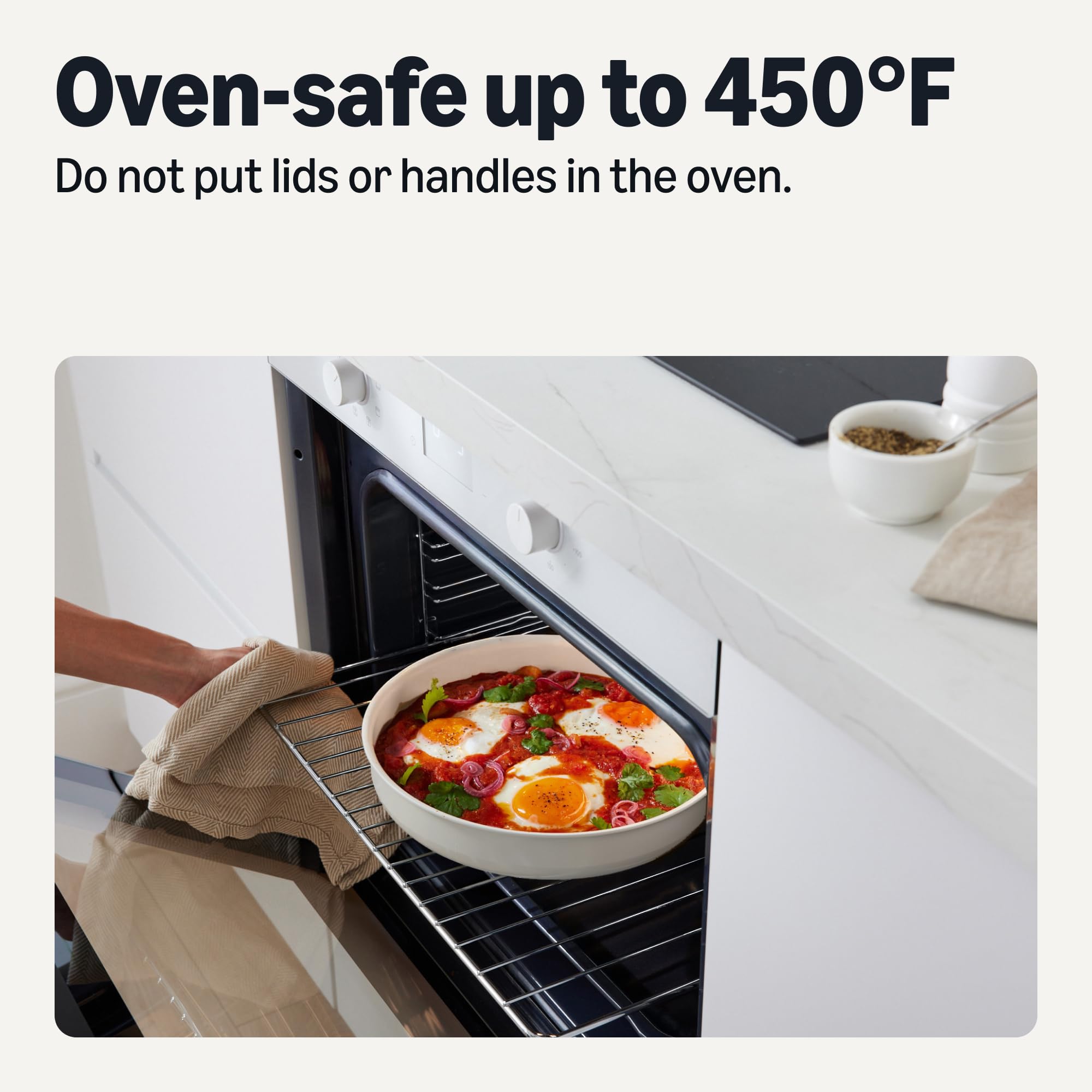 VERSATILE COMPATIBILITY: Suitable for all stovetops, including induction; pots and pans are oven-safe up to 450°F; do not put lids or handles in oven; dishwasher-safe excluding handles