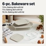 6-PIECE BAKEWARE SET: 6-piece set of 3 oven-safe glass baking dishes and 3 lids for making casseroles, desserts, stews, and more