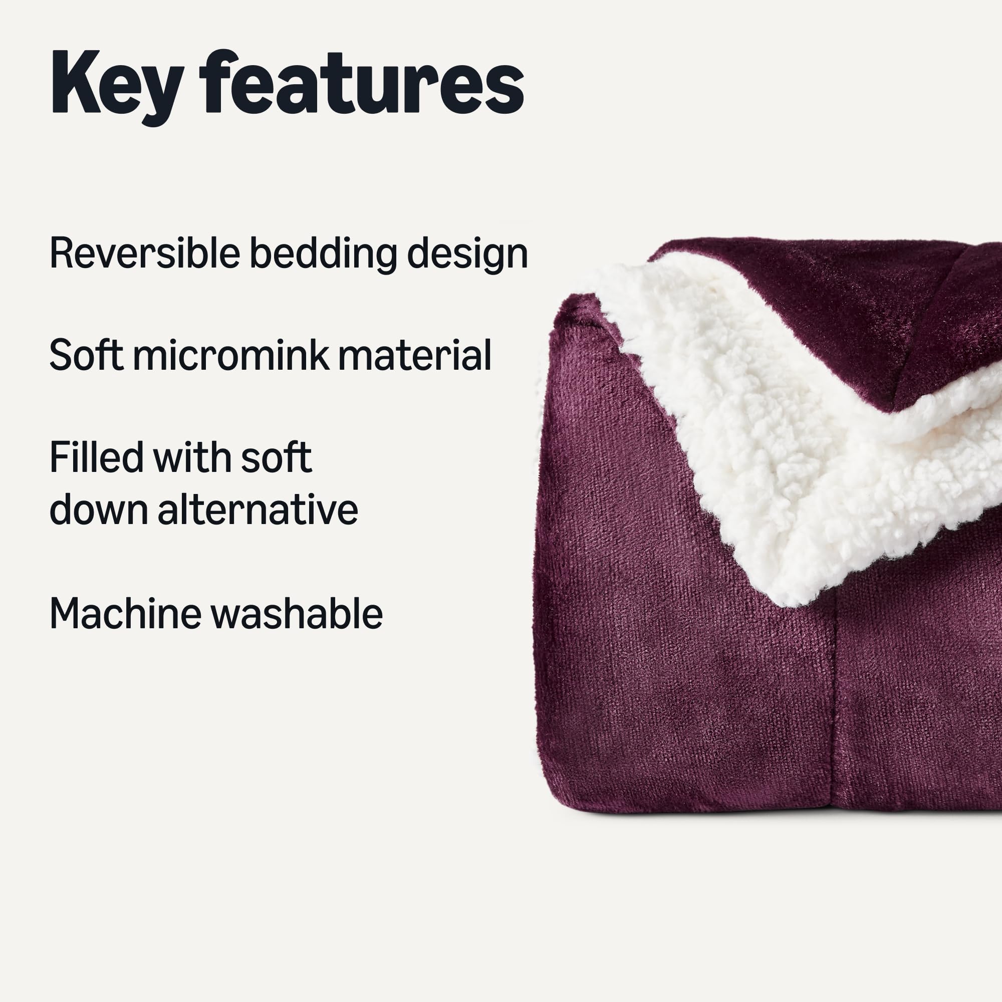 Reversible design in Plum with 220 GSM velvety flannel on one side and 260 GSM plush sherpa on the reverse