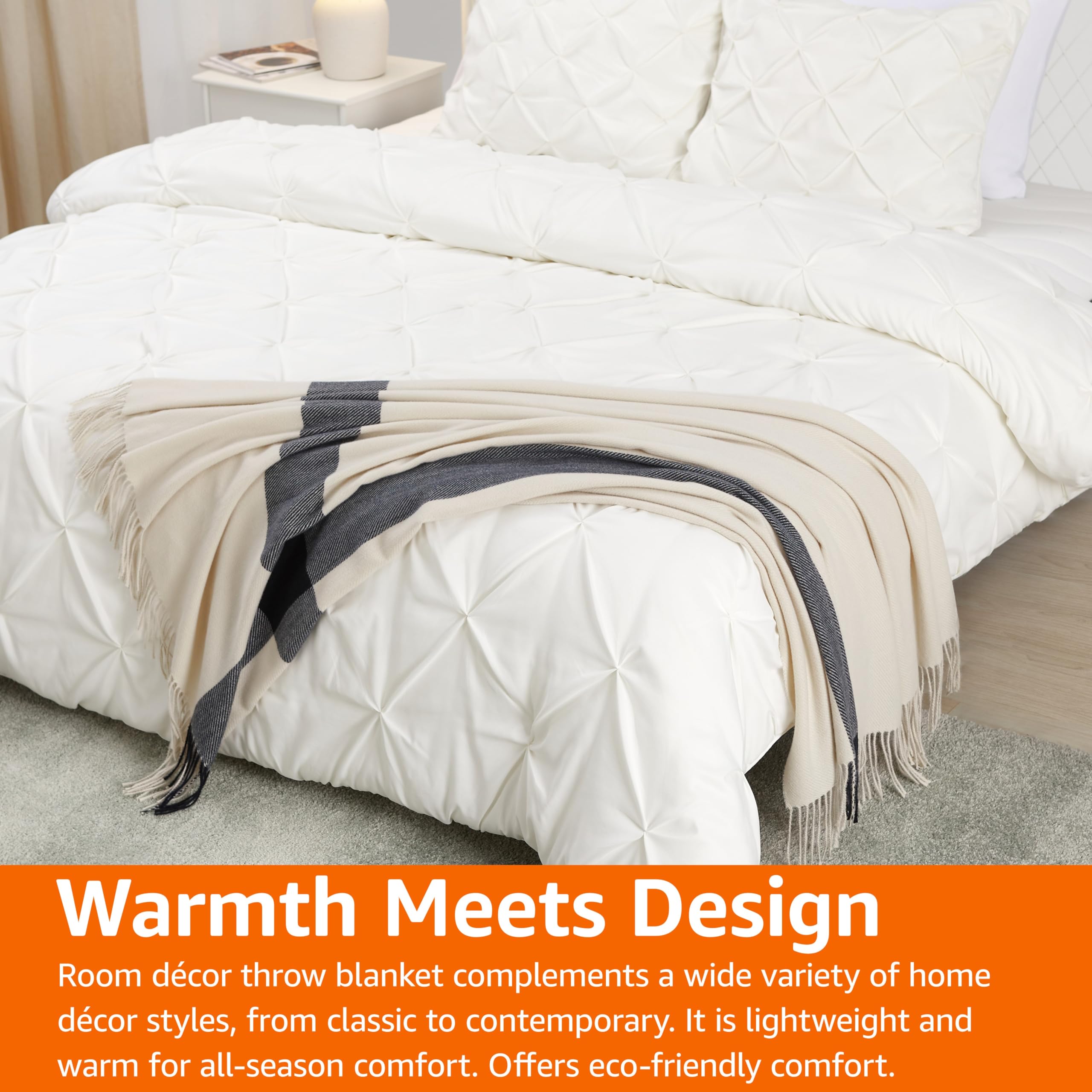 Room Decor Throw Blanket, Lightweight and Cozy in Polyester, Ivory With Blue Cross-check Pattern, 50″x 60″