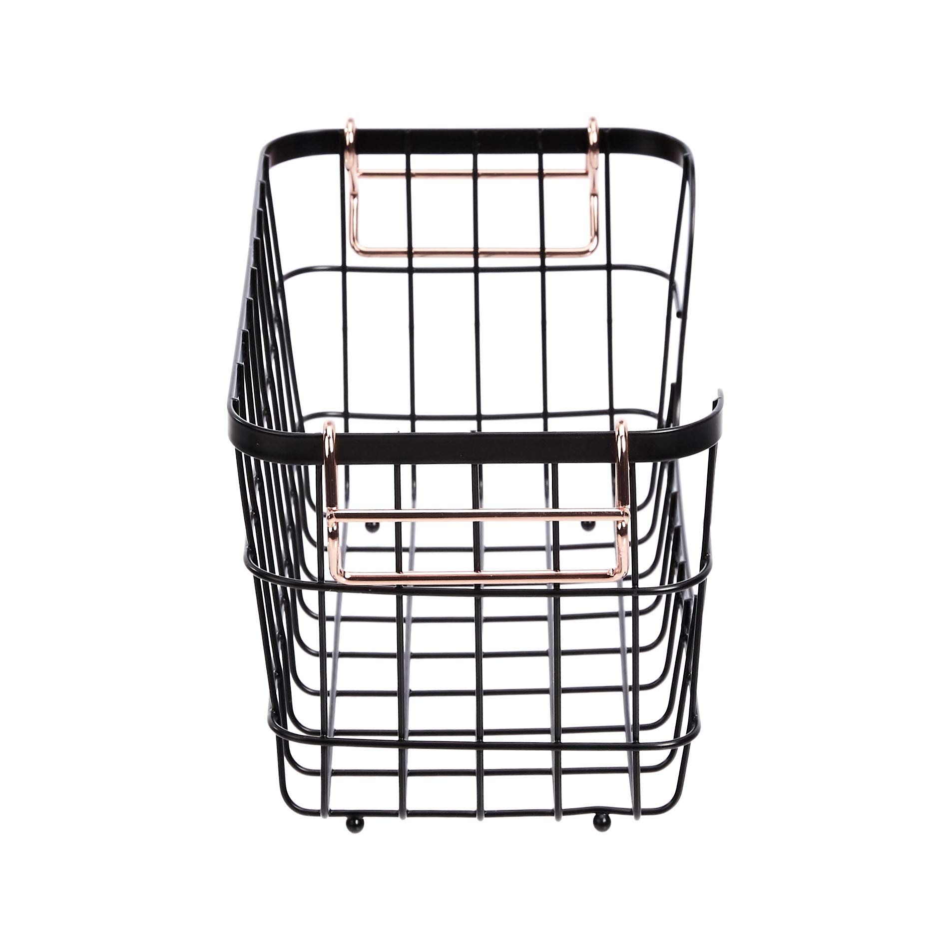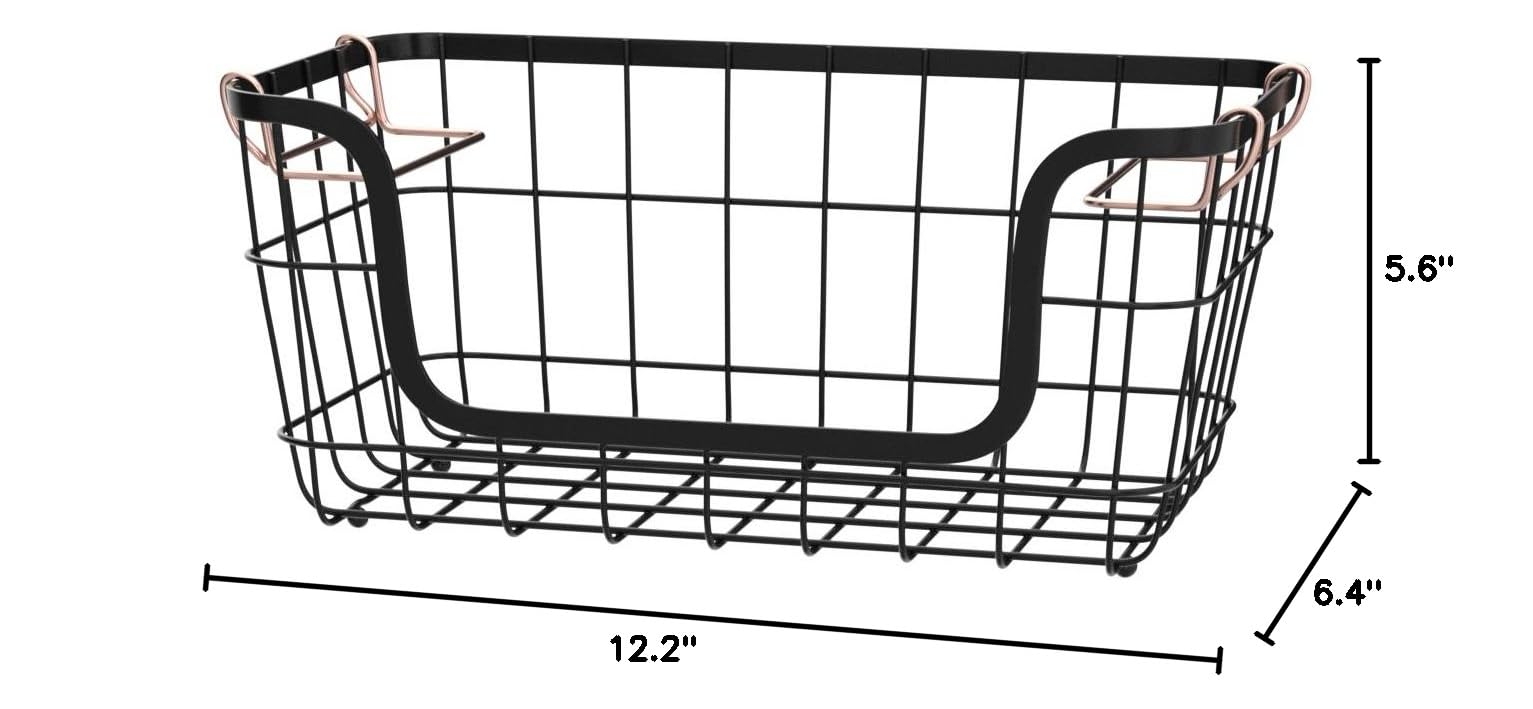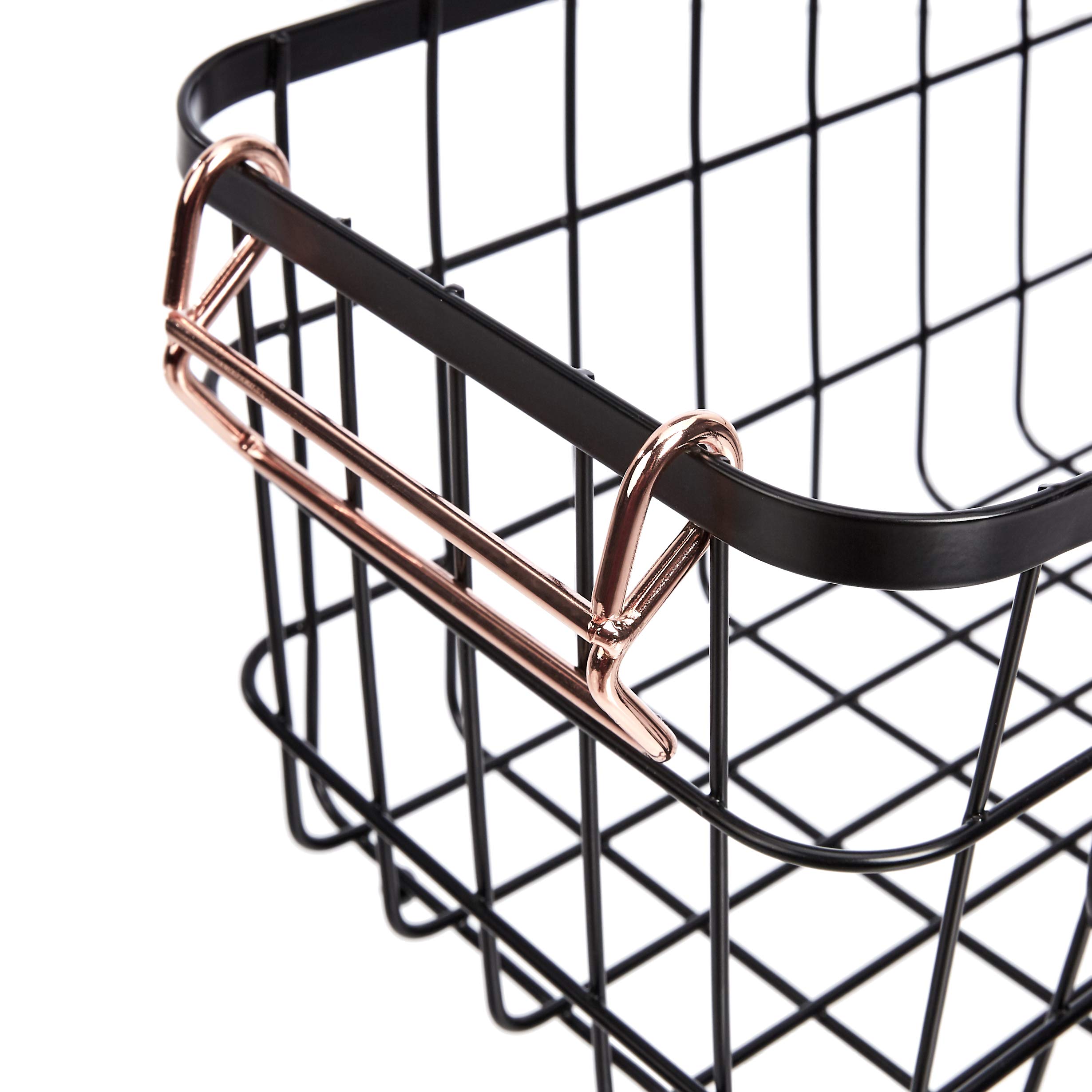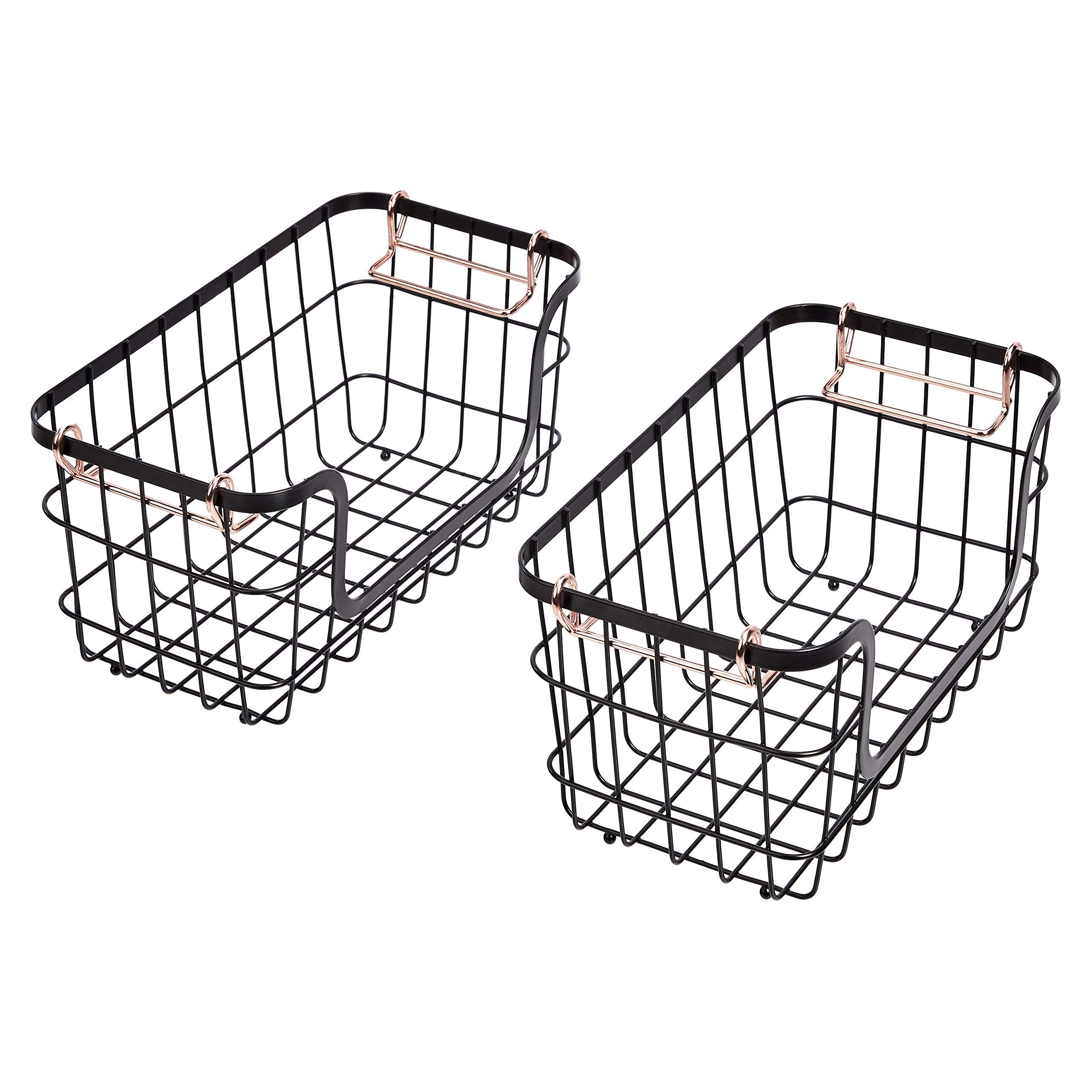 Set of 2 black wire storage baskets with rose gold handles for home organization