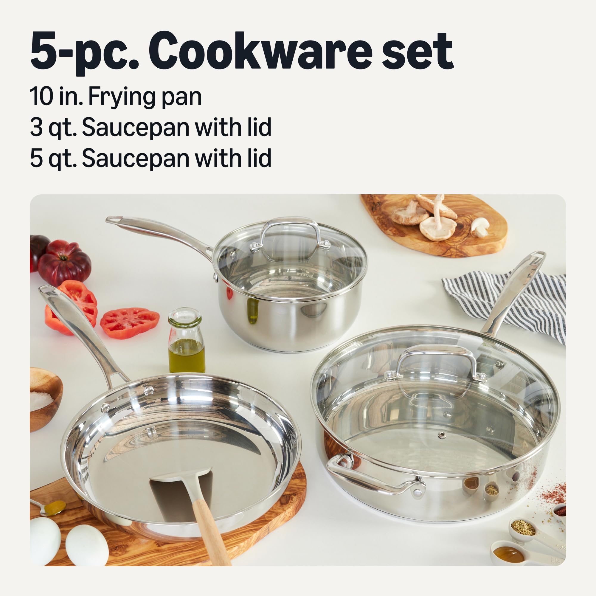 Stainless Steel Cookware Set, 5-Piece Set, All Cooktop Friendly, Dishwasher-Safe