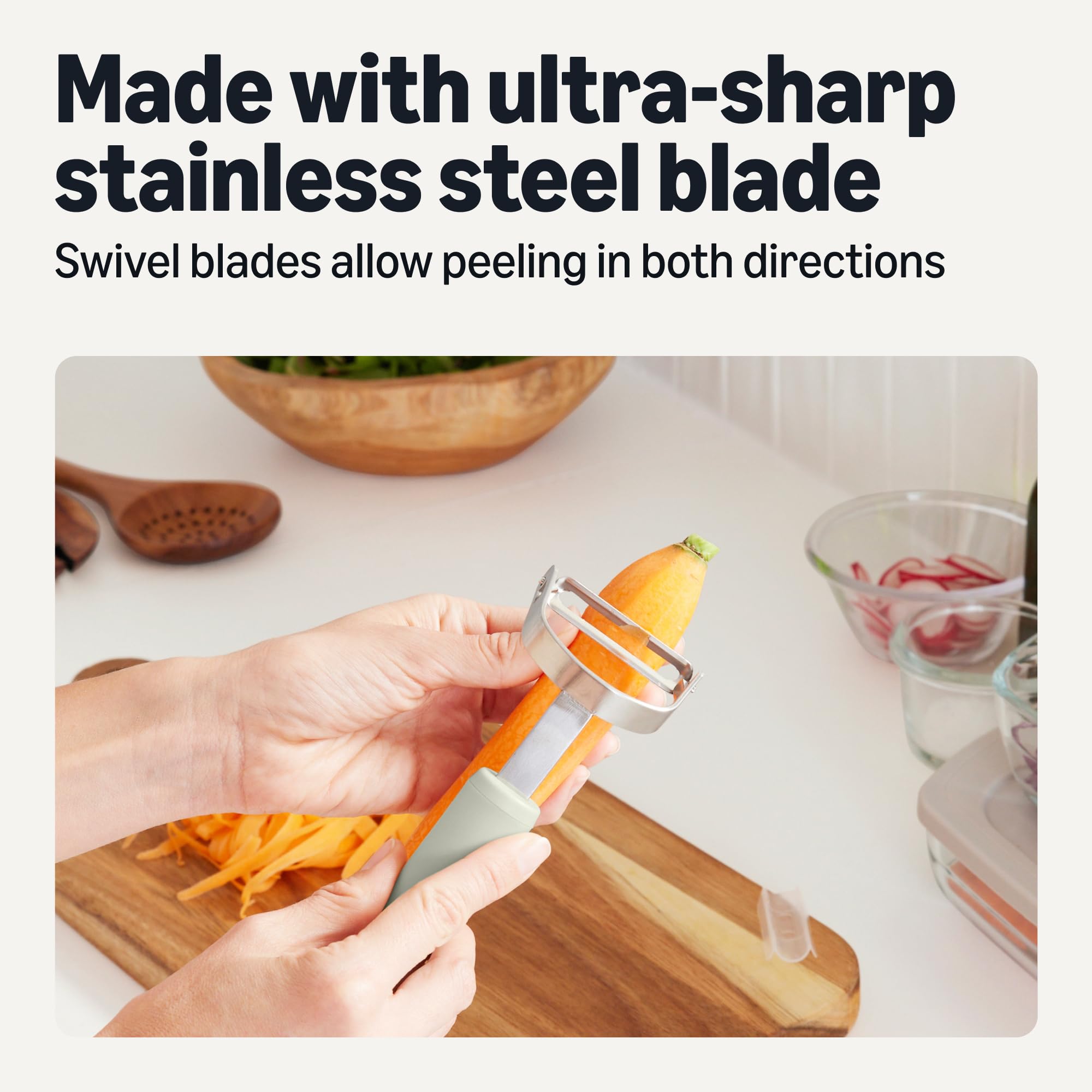 STAINLESS STEEL BLADES: Ultra-sharp swivel and horizontal blades made of stainless steel can be used in either direction for more precise, efficient peeling