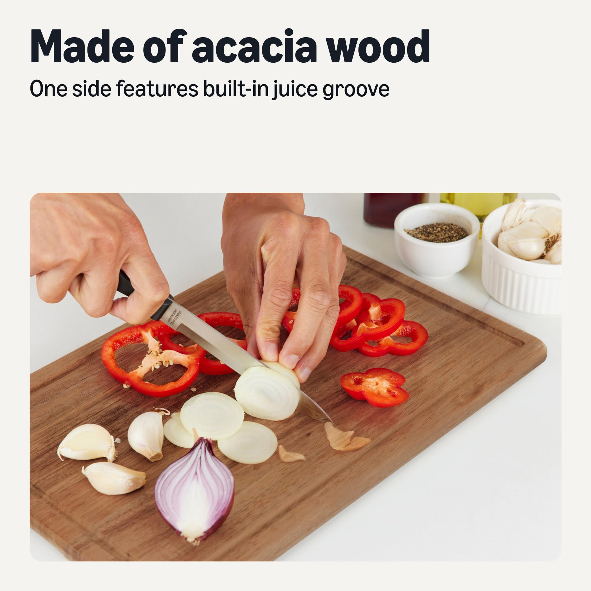 FUNCTIONAL DESIGN: Knife-friendly wood cutting board design with built-in handle and juice groove to catch liquid run-off