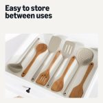 6-PIECE UTENSIL SET: 6-piece wood kitchen utensil set for cooking and serving; includes fork, spoon, slotted spoon, spatula, slotted spatula, and combo spatula/spoon